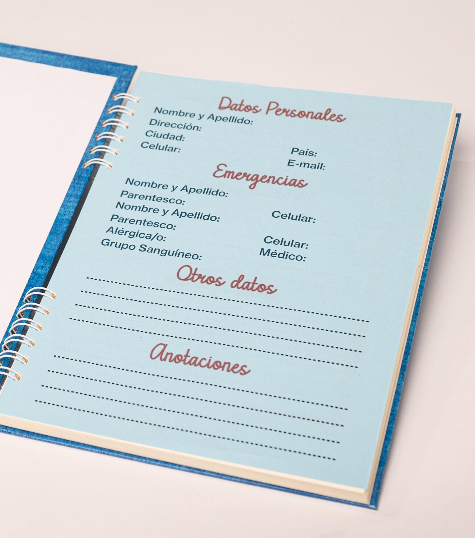 - Hoja de datos personales e información general. Esta hoja se encuentra al abrir la tapa delantera.