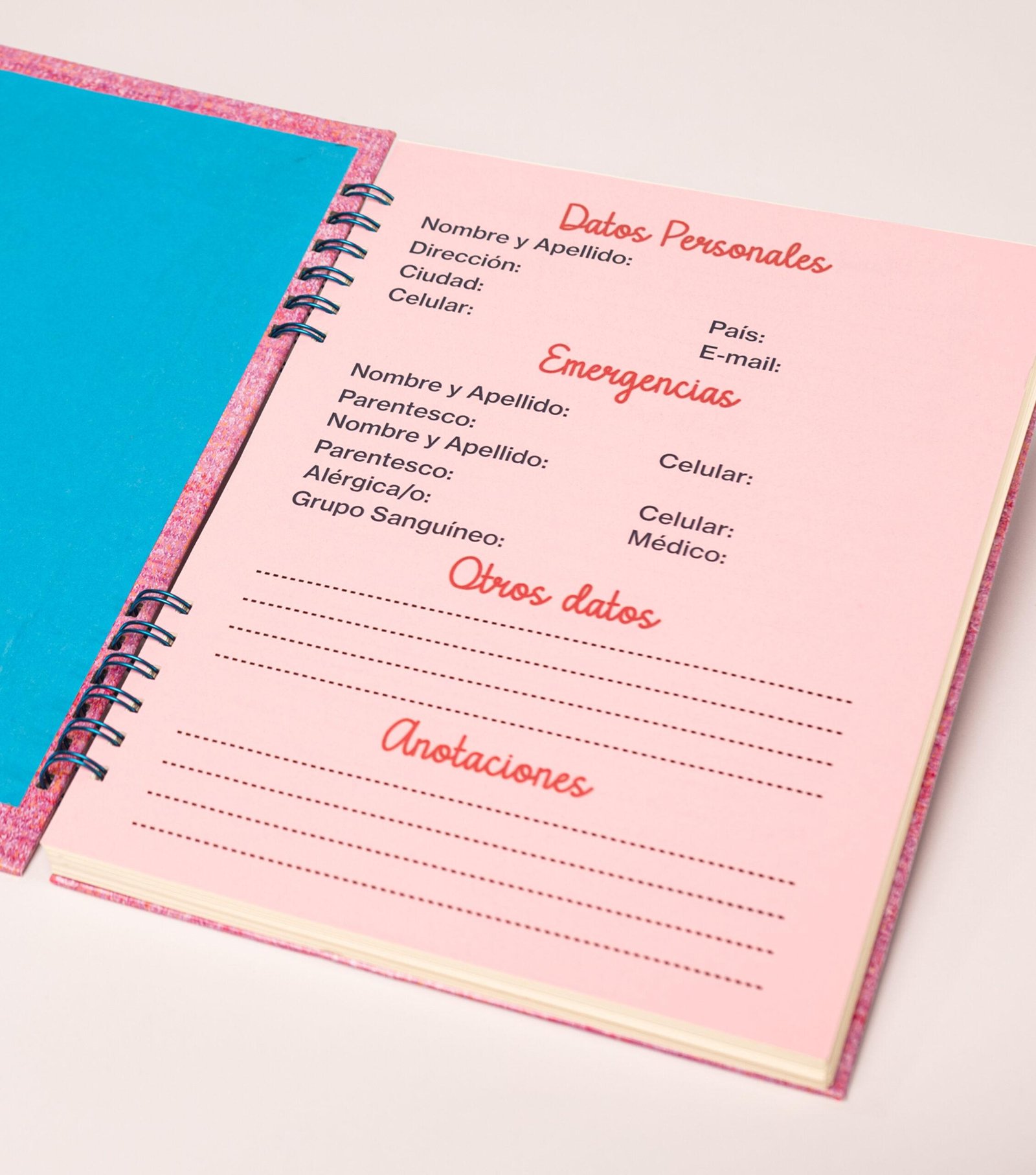 - Hoja de datos personales e información general. Esta hoja se encuentra al abrir la tapa delantera.